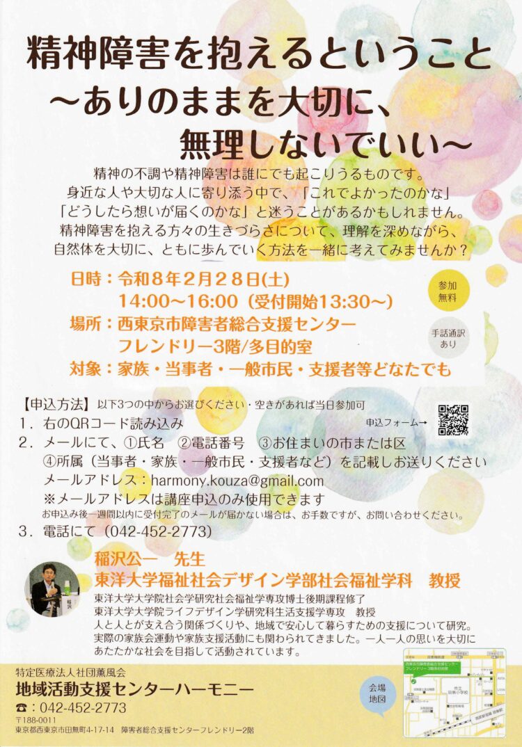 この度、令和8年2月28日(土)14:00~16:00にハーモニー講座「精神障害を抱えるということ~ありのままを大切に、むりしないでいい~」を開催することとなりましたのでご案内いたします。